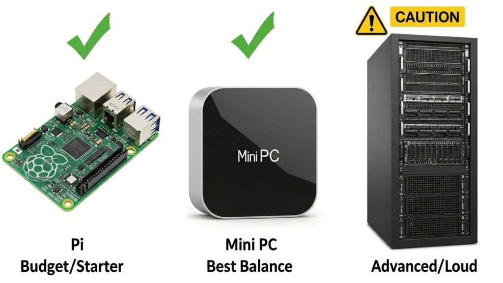 Do not buy a loud, power-hungry enterprise server just because it looks “cool.” The noise will drive you crazy, and the electricity bill will be shocking. Start small and upgrade only when you actually run out of computing power.