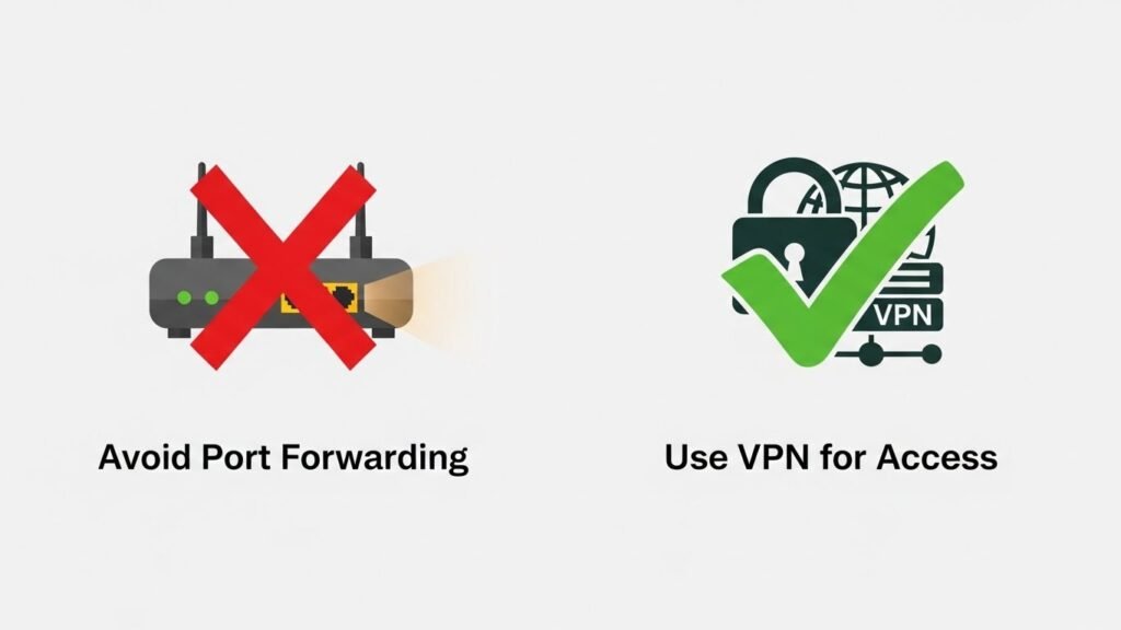 Never simply open ports on your router (Port Forwarding) unless you strictly know what you are doing. This invites hackers to attack your home network. Use a VPN like Tailscale or WireGuard to access your lab remotely—it is much safer.